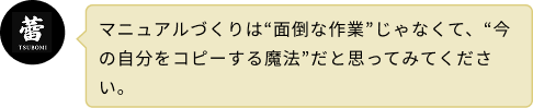 まず行うべきは、自分しかできない作業を洗い出し、マニュアル化して再現可能にすることです。
